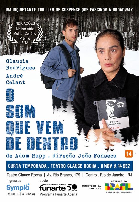Primeira montagem no Brasil da peça The Sound Inside, de Adam Rapp, O Som que Vem de Dentro está de volta aos palcos em curta temporada no Teatro Glauce Rocha, no Centro do Rio, de 08 de novembro a 14 de dezembro. Sob a direção de João Fonseca e tradução de Clara Carvalho, o espetáculo, aclamado mundialmente e sucesso na Broadway, traz uma trama de suspense intensa e cheia de nuances, uma imersão no universo de dois personagens que, mesmo distintos, se encontram na fragilidade humana diante da vida e da morte. As sessões em novembro acontecem de quinta a sábado, às 19h, e domingo, às 18h. Em dezembro, sexta e sábado, às 19h, e domingo, às 18h.