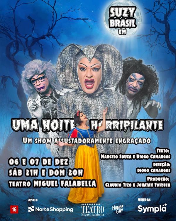 Novo espetáculo de Suzy Brasil e seu criador Marcelo Souza, “Uma Noite Horripilante” chega ao Teatro Miguel Falabella, no Norte Shopping, no Cachambi, para apenas duas apresentações nos dias 06 e 07 de dezembro, sábado, às 21h, e domingo, às 20h. O show de humor traz alguns personagens inéditos e outros já conhecidos do público tanto no humorístico LOL – Se rir já era, da Amazon Prime, no qual Suzy foi vice-campeã da terceira temporada do programa em 2023, como também da internet.