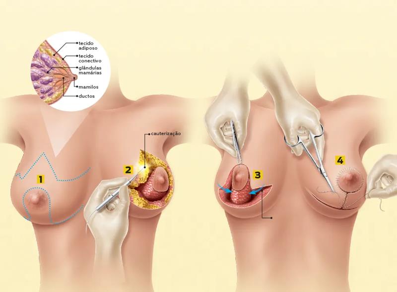 A técnica envolve a remoção do excesso de tecido mamário, gordura e pele, com remodelação do formato e, quando necessário, reposicionamento da aréola. O objetivo é deixar os seios mais leves, firmes e proporcionais ao corpo.